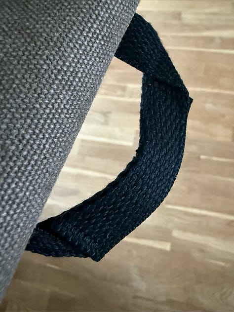 The other day I found this black Italian wool with beautiful pattern work in the leftovers at Textile in Potsdam. It nails the feel and quality I imagine for my brand. Like most of my advanced prototypes, the outer material is upholstery fabric—robust, cozy, tactile. These won’t be the final materials, but they definitely represent the right vibe for this particular piece.