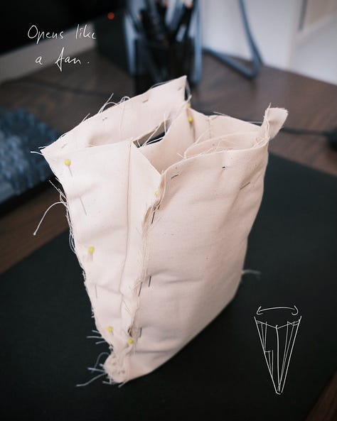 I had to include the fan folds in the main seam and connect the sides after inverting the whole bag. Too nerdy? I could go on about how I stabilized the fan to fold in the right direction, but I guess you‘d fall asleep ;)